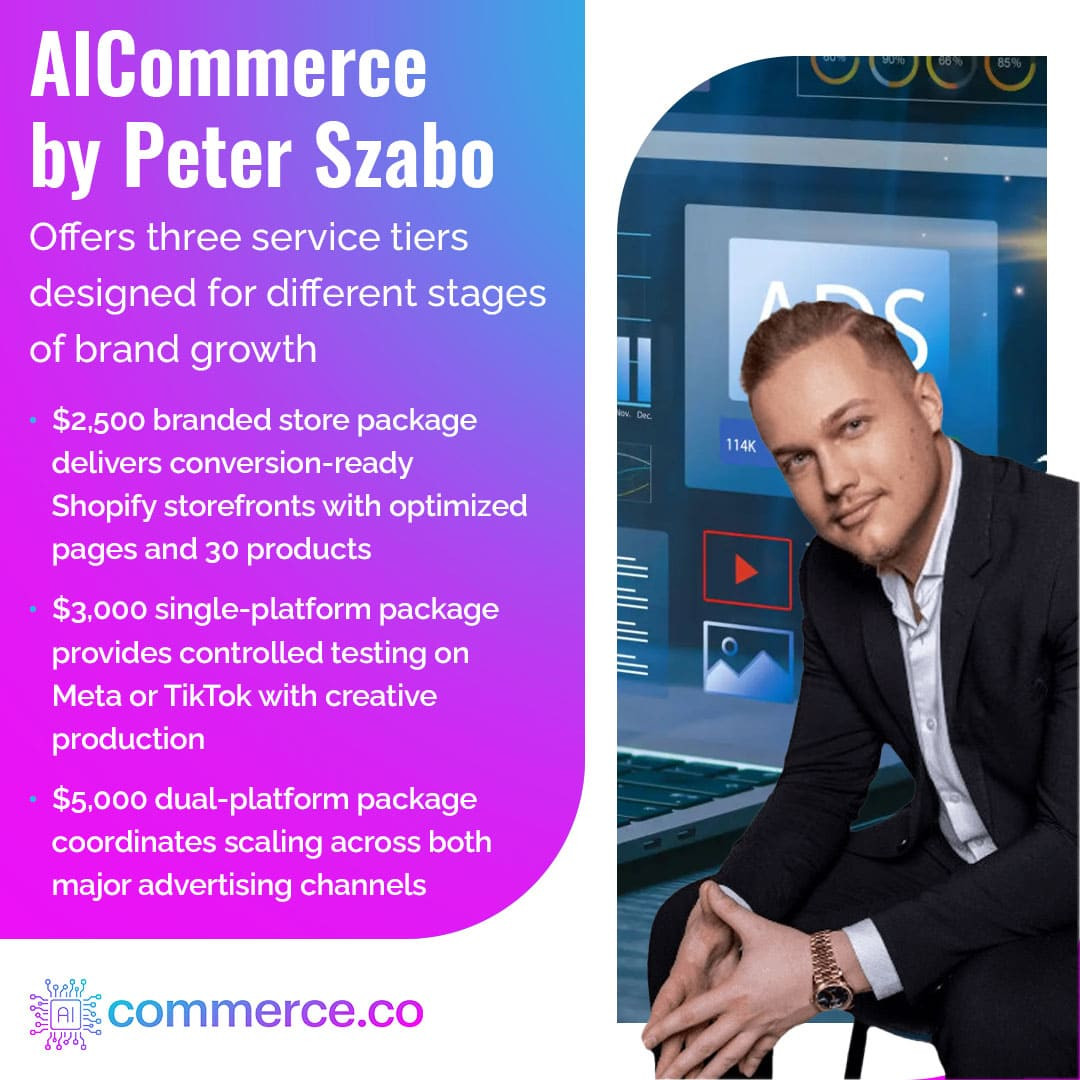 AICommerce, founded by Peter Szabo, integrates A.I.-supported e-commerce systems with done-for-you store development, structured coaching, and paid advertising management. The company has assisted more than 300 clients and contributed to over $100 million in combined revenue. Its offerings, ranging from Shopify store creation to multi-channel ad operations, provide established brands with predictable, scalable digital growth pathways.